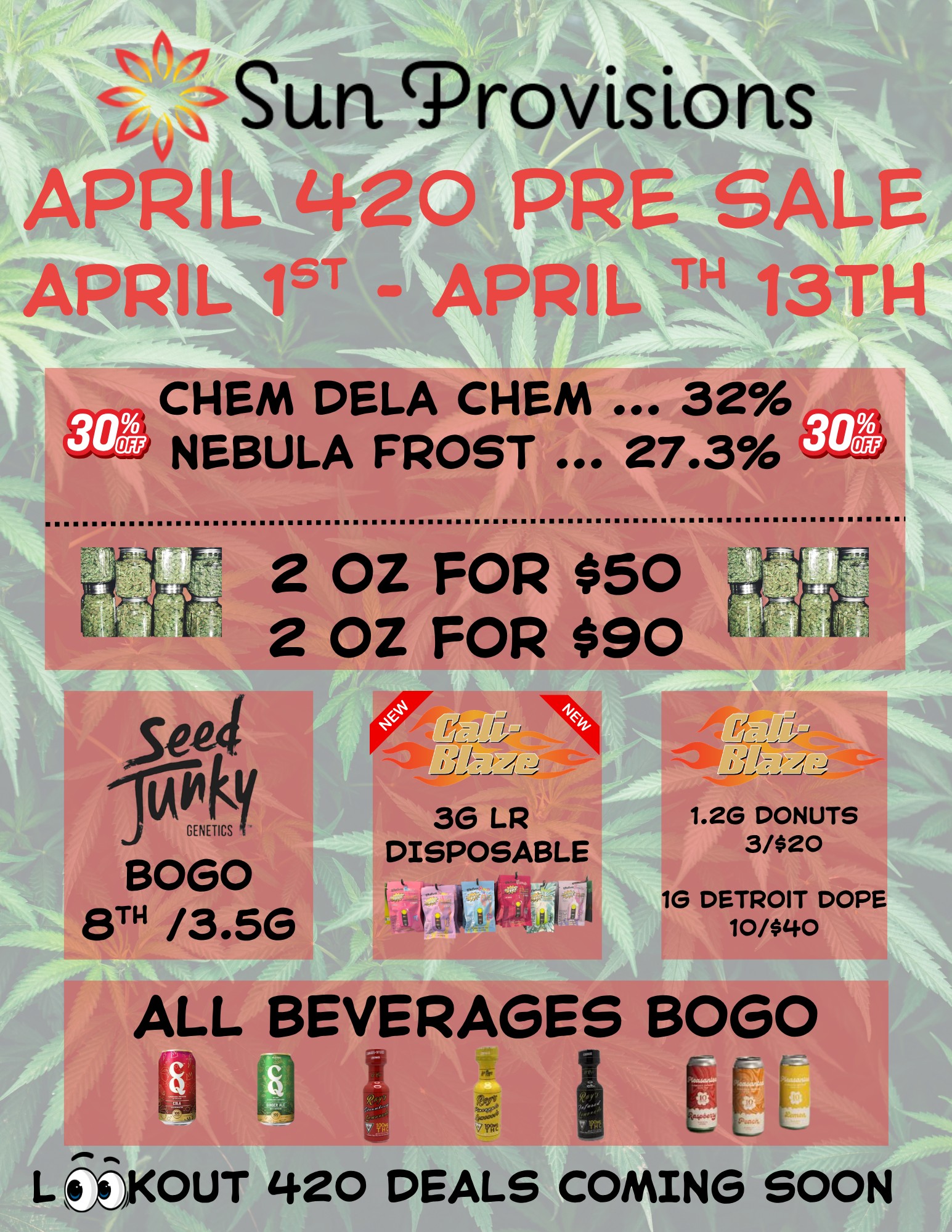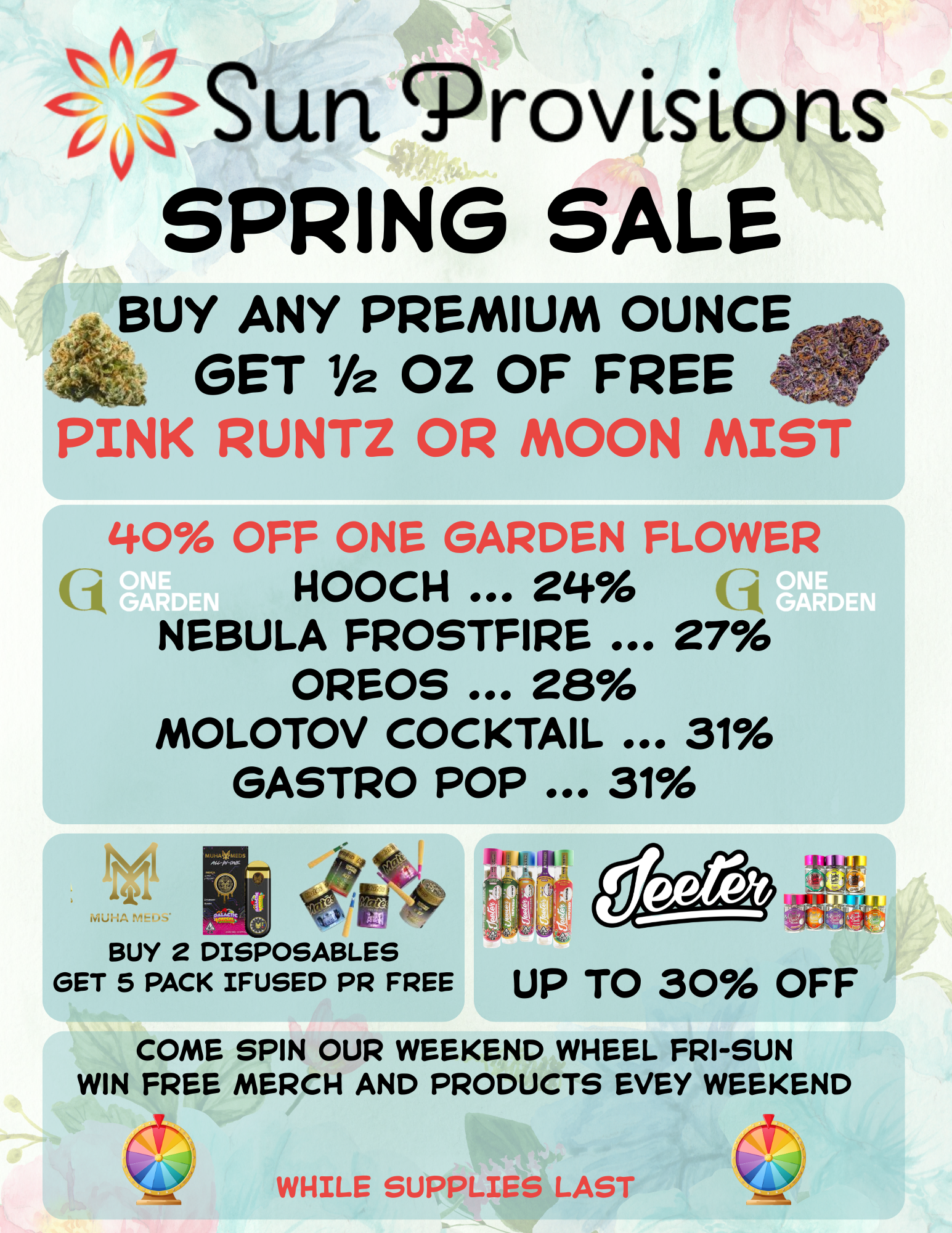 At Sun Provisions, we offer a wide range of cannabis products including flower, edibles, concentrates, and more. Visit our menu to explore our selection.