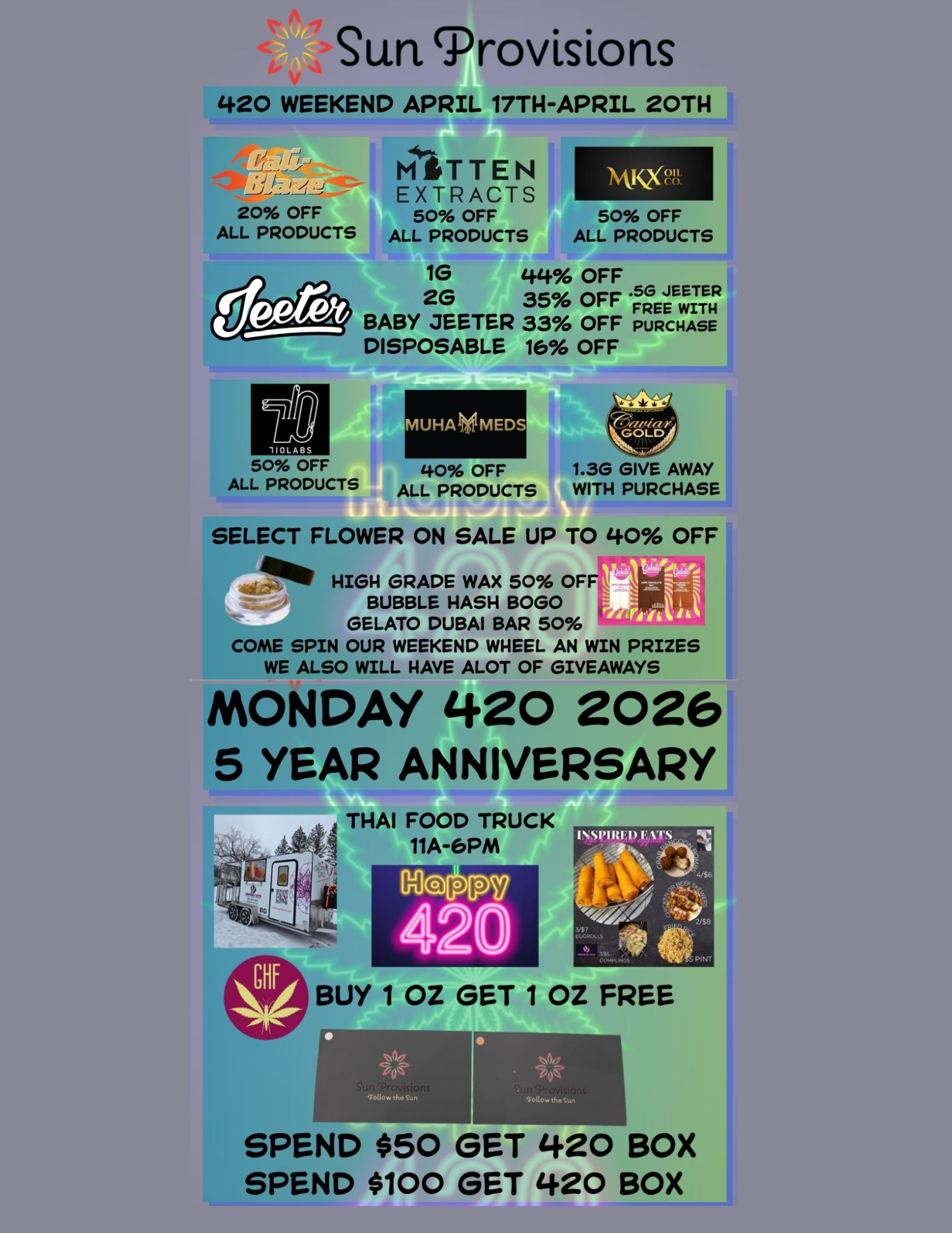 Sun Provisions is your local hub for exploring a diverse array of cannabis, proudly serving Southern Michigan with care, and expertise.